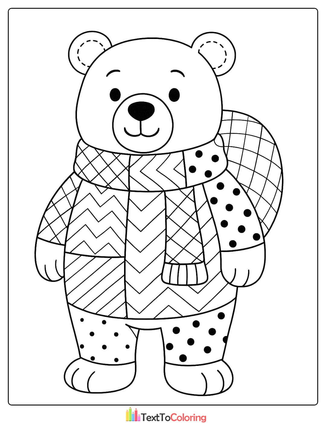 Adorable cartoon bear wearing a patterned scarf and patchwork outfit coloring page