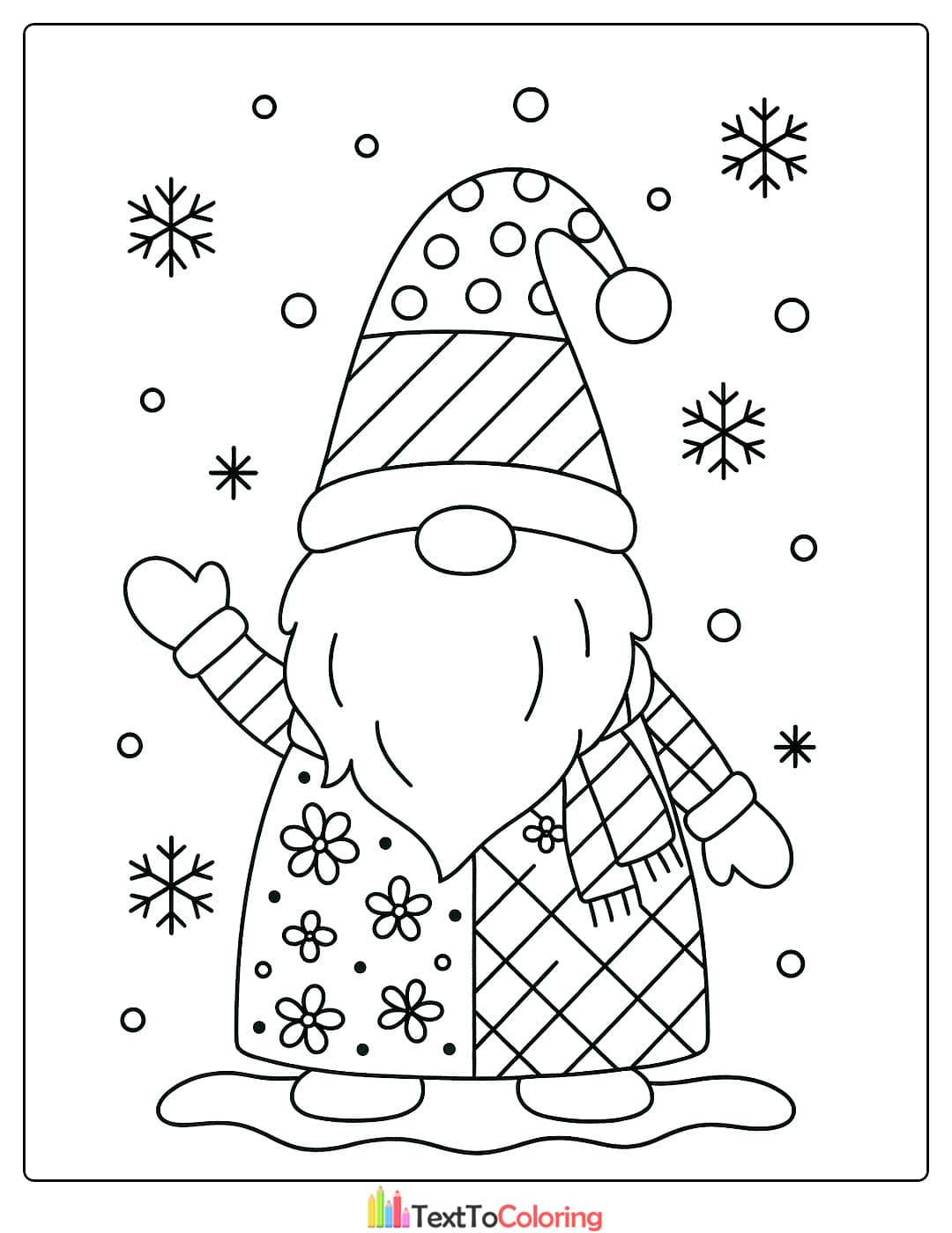 Get ready for winter with this charming patchwork Christmas gnome coloring page
