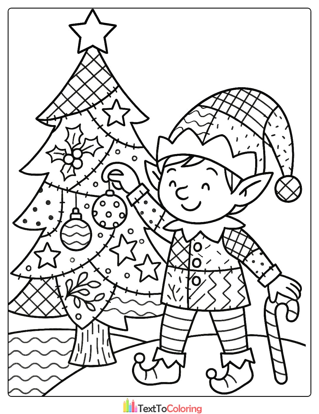 Elf Decorating Patchwork Christmas Tree Coloring Page