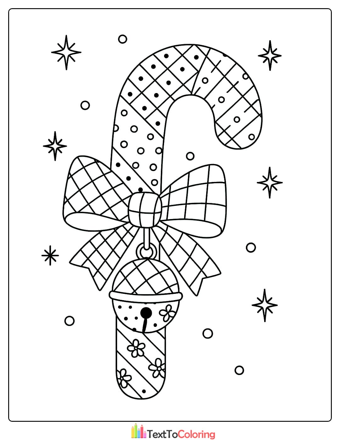 Christmas candy cane with a patchwork bow and jingle bell coloring page