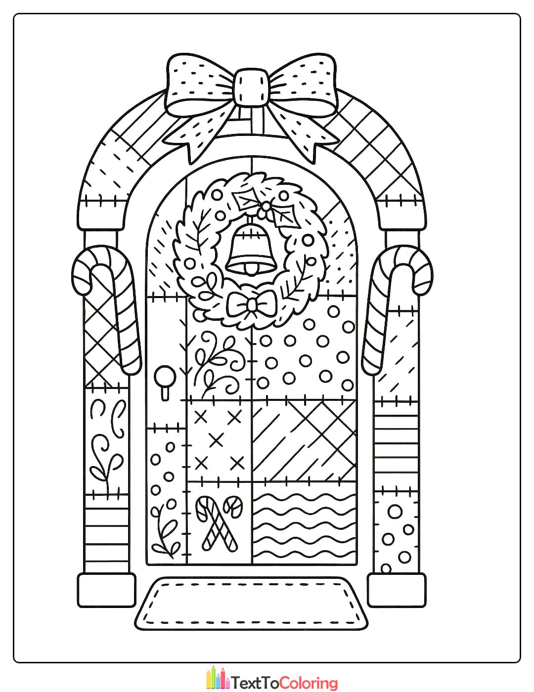 Festive front door with patchwork door panels a wreath bow and candy cane columns
