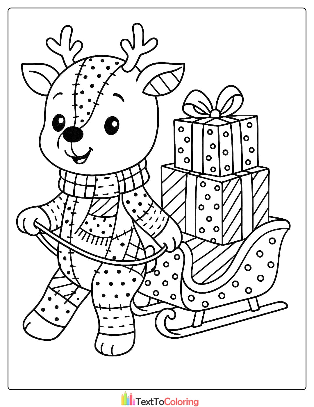 Sweet patchwork reindeer pulling a sled full of stacked Christmas gifts coloring page