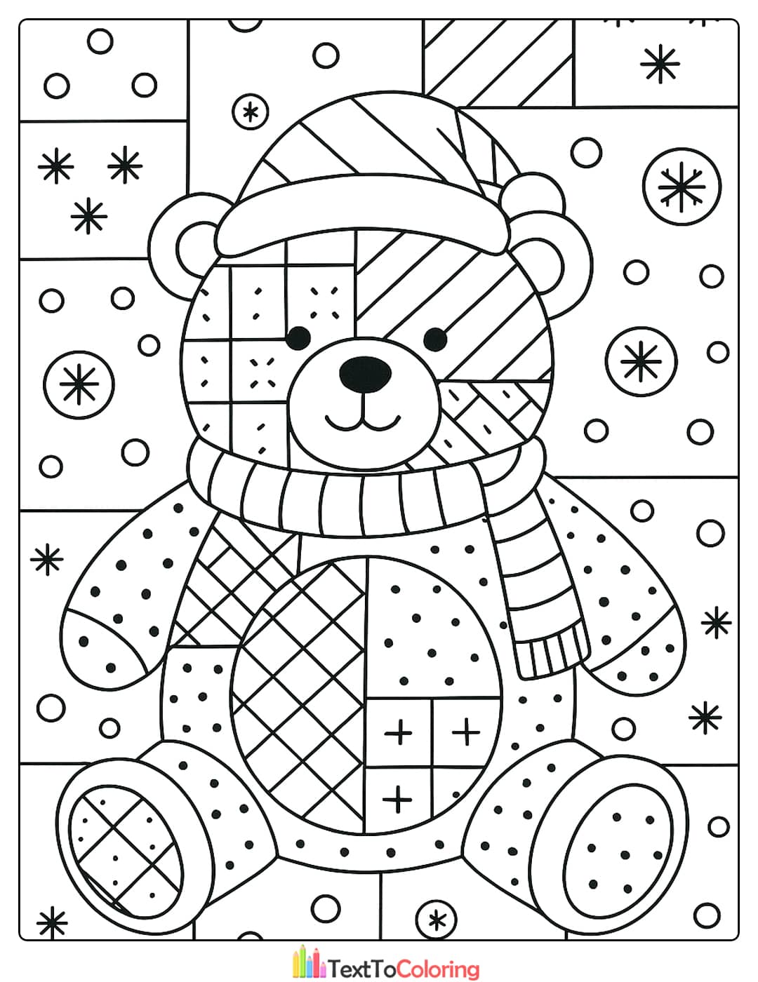 A charming patchwork teddy bear coloring page for a cozy winter day