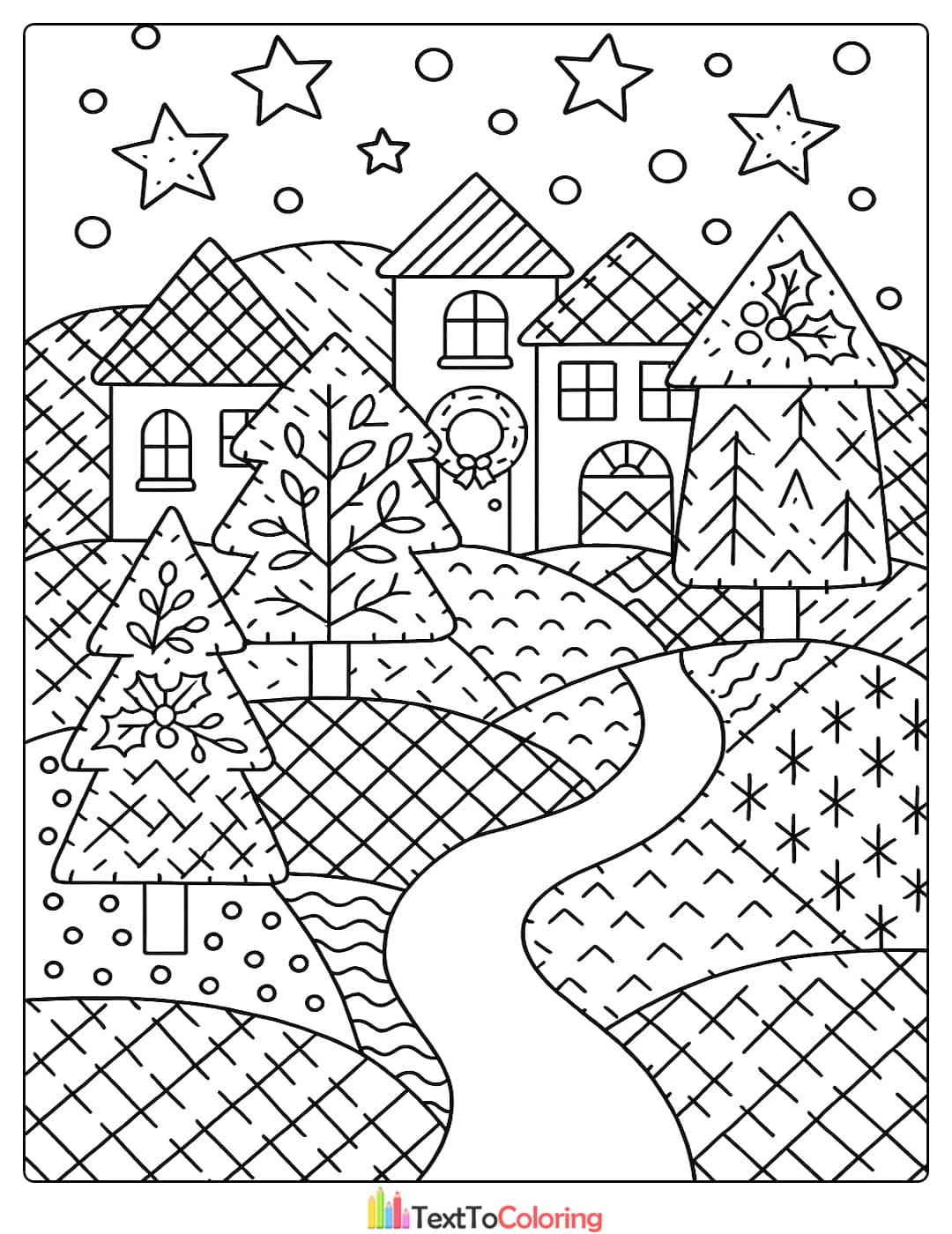 Detailed Patchwork Pages: Smaller sections, richer Christmas scenes – ideal for teens, adults, and mindful coloring fans.