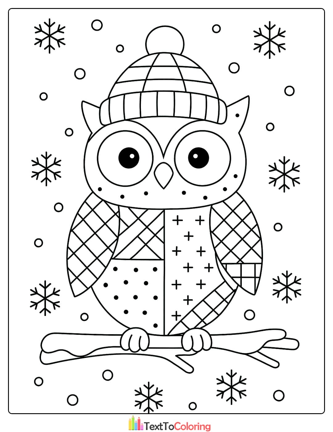 Cute owl wearing a winter hat sitting on a branch with a patchwork pattern on its body coloring page
