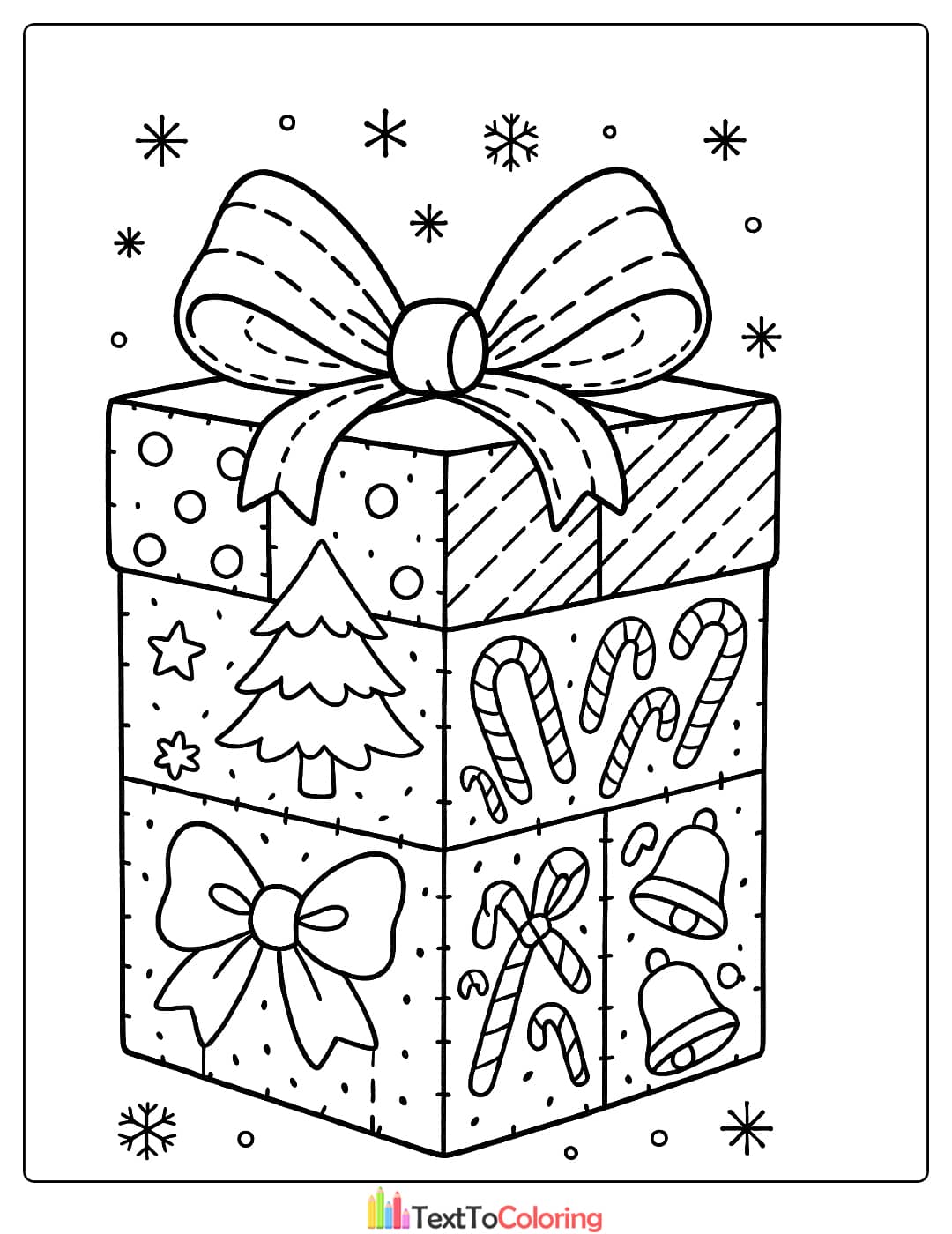 A fun patchwork gift box stack coloring page ready for Christmas morning