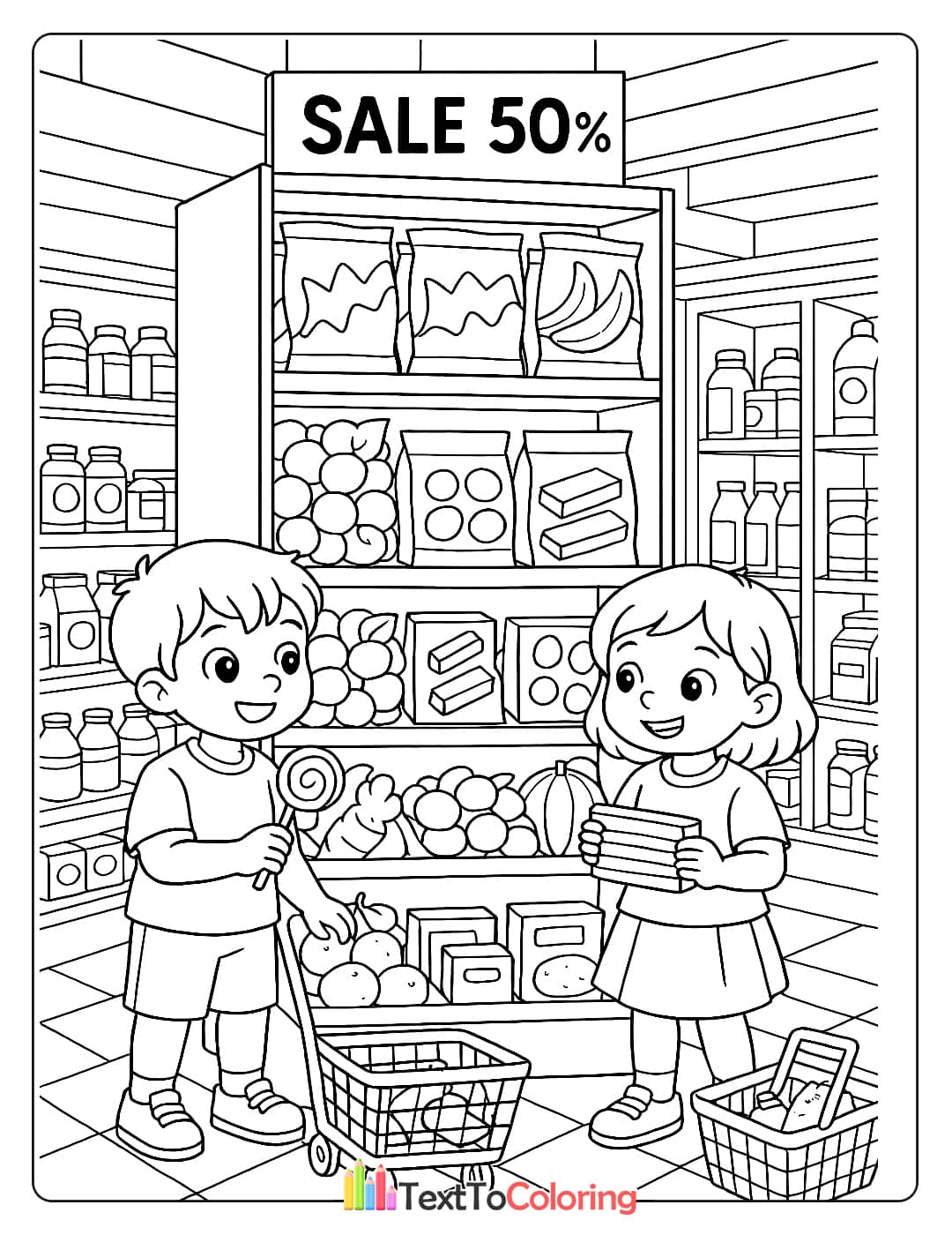 The fun doesn’t stop after coloring. Hang your mini-mart artwork on the fridge, turn it into a shopping list cover, or use it in a classroom display. Share your creations online to inspire friends and family.