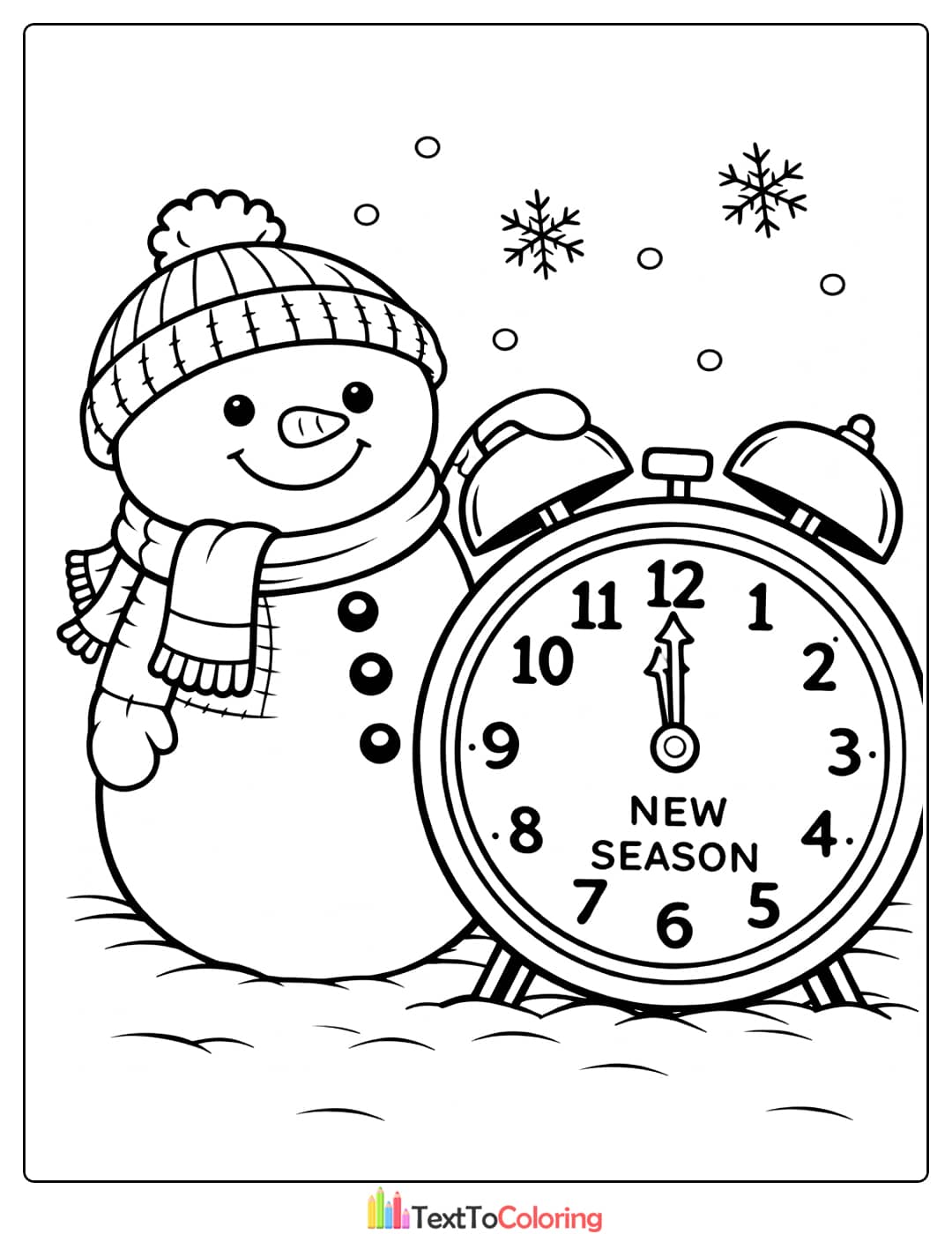 Snowman new season clock coloring page